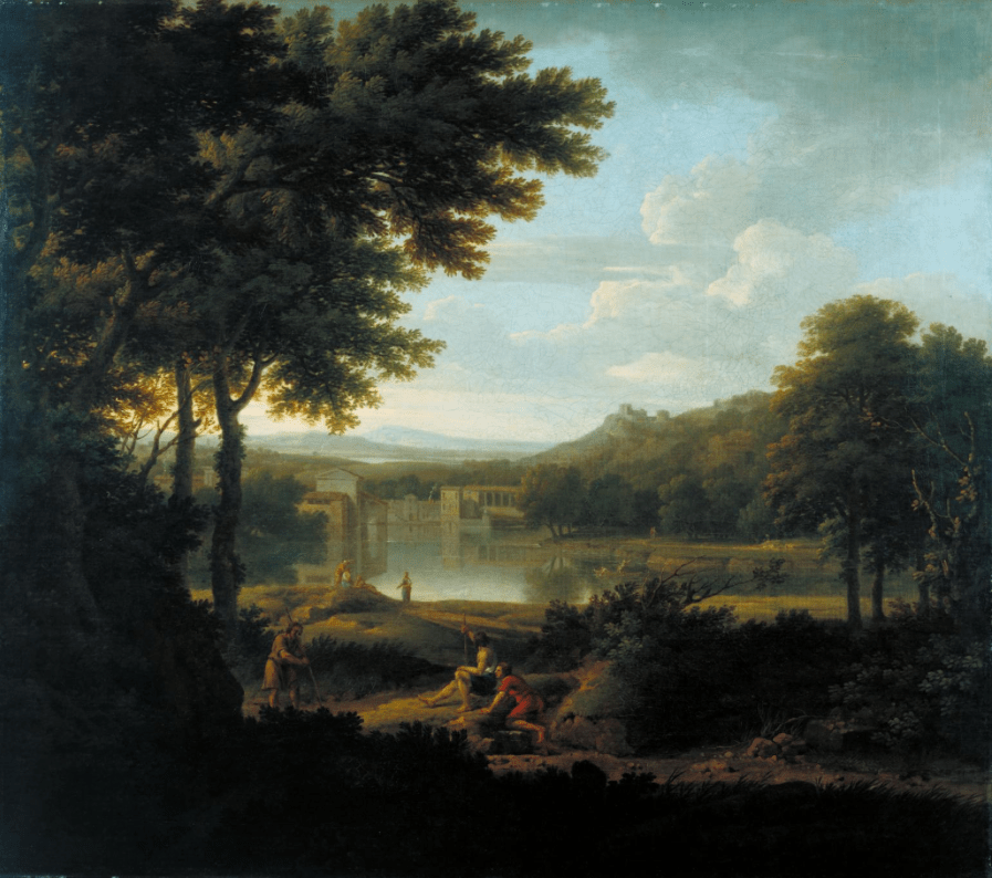This is a purely imagined scene. Lambert never visited Italy but practiced the style of Italian classical landscape painting. Scenes like this were often used as fixed decoration in houses. Again, depicted is an idyllic scene with careful consideration to composition with the gentle light illuminating the two figures in the foreground and reflected on the lake. The colour palette is muted with a little red to draw the eye in.