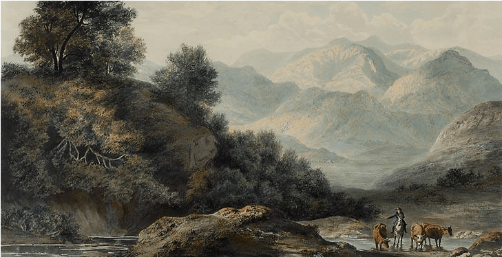 The landscape paintings of the eighteenth and nineteenth century can be characterised by their use of light, colour and composition. Many of the paintings have a focal point such as a group of people, animals, buildings or perhaps water. Often the main scene is framed with trees or rocks. The scenes tend to portray idyllic rural scenes or in contrast dramatic natural phenomenon.