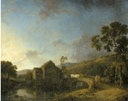 Depicting an idyllic rural scene with soft light and muted warm colours. Gainsborough’s early landscape work didn’t sell well and he turned to portraits eventually increasing his fame through exhibiting portraits of famous or notorious subjects. There is foreground interest here and the eye is drawn to the mountain in the distance which is framed by the trees either side.