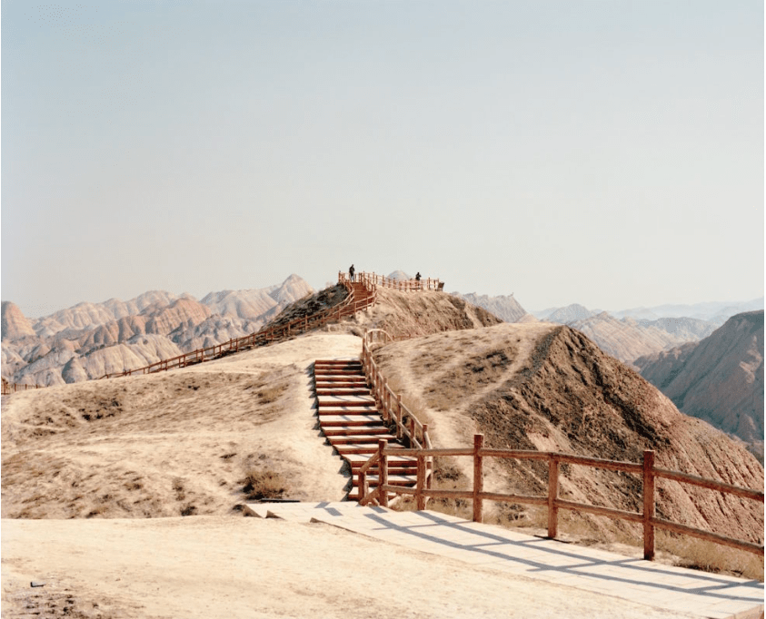 Her other ongoing project, Universal Experience, instead suggests the insignificance of humanity set against the vastness of Chinese and Mongolian landscapes. Her work combines ideas of the sublime, the tourist gaze and collective memory with theories on survey photography and the ways in which we try to control the land around us, placing the natural and the artificial side by side.