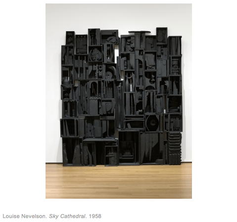 Nevelson, fascinated with the colour black which she stated was “the most aristocratic colour of all”, a colour of acceptance as it contained all colours, created Sky Cathedral to evoke a sense of a shrine and a place of devotion.