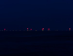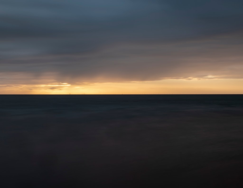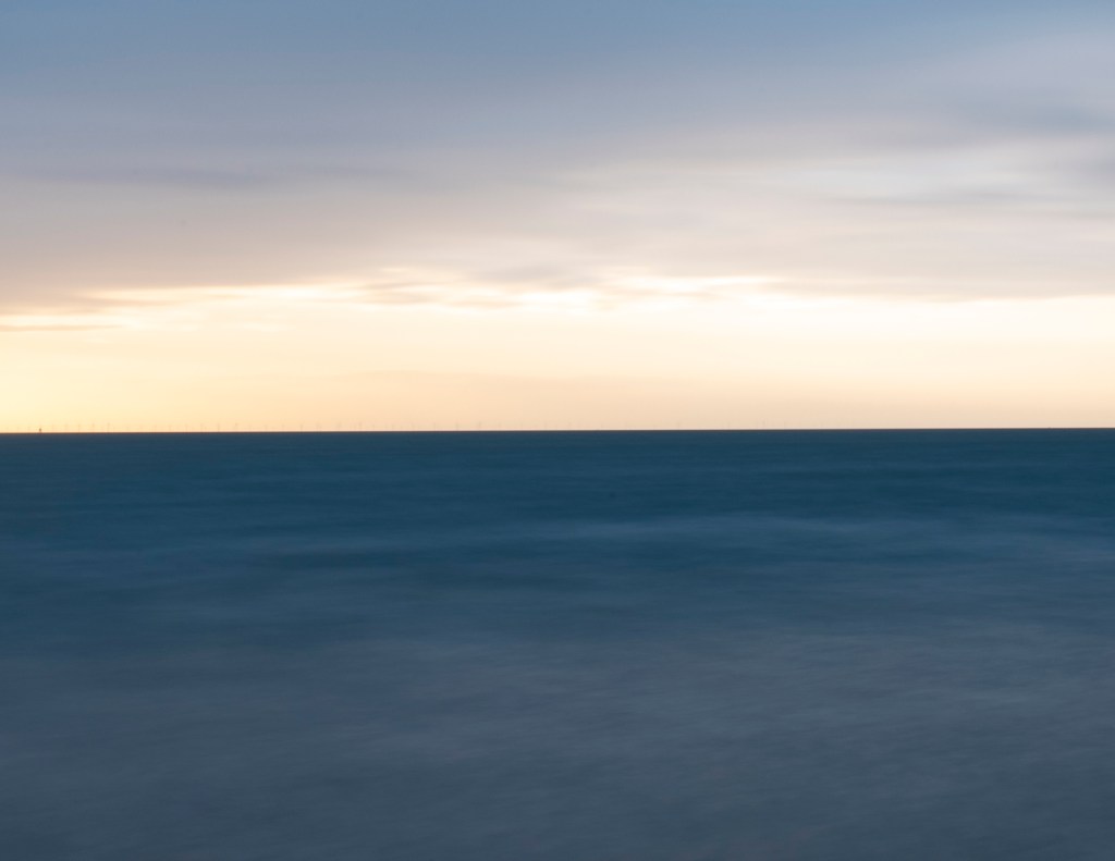 There were some happy accidents in the beginning. Image 1 above was a result of trying to auto-focus. Image 2 was when I did manage to focus although I realised I was going to have to try to avoid the lights on the wind turbines of which there are many. Image 3 was the result of really clear day. It was at this point that I realised I was going to need to use a filter and smaller aperture. Images 4 and 5 were taken on a strange hazy day. Although there was an unusual light and haze where the sea became almost pink for a while, the cheap filter I was using contributed to the purple colour. I decided to reject these images in favour of what seemed more natural colour although it’s possible I will need to rethink my selection.