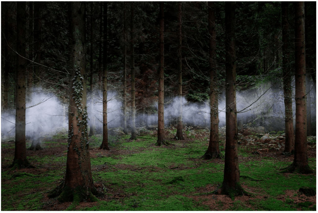 Between the trees uses smoke that sits like clouds or mist in amongst the trees which for me represents breath (of life?). Trees and forests are often analogous to lungs because of their ability to provide us with oxygen which also adds to this sense of a ‘living’, in an anthropomorphic sense, entity.