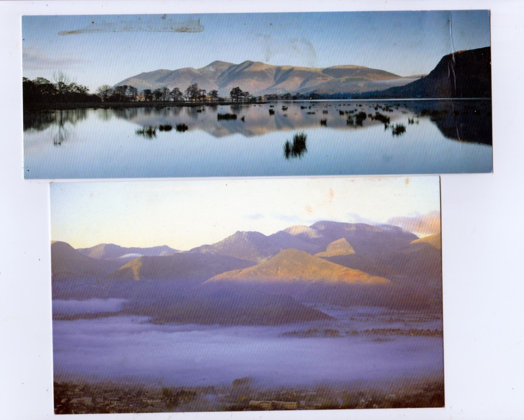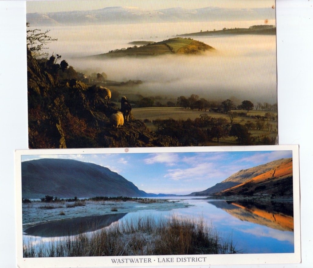 Whilst one of these was sent to me, the others are what I’ve bought whilst away and then not sent usually because I’ve forgotten stamps. The four outer postcards are all Lake District. Upper right is Derwentwater and the Catbells ridge. This is probably the truest representation of the place. I could easily find that exact viewpoint and I’ve experienced days like this, clear sky, calm water and that early morning light that creates perfect reflections in the water. It’s a common type of image for the Lake District, hills reflected in the water.
