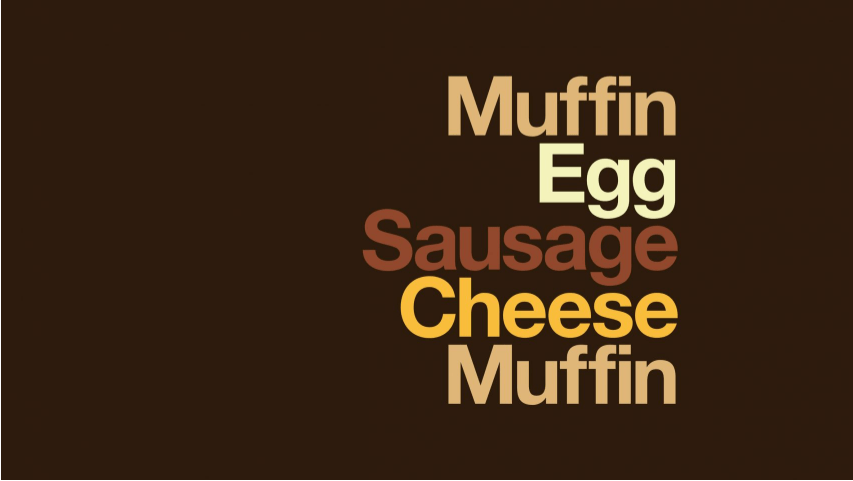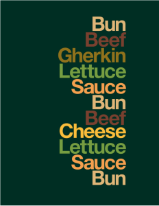 - The colour palette is typically from the Pantone colour charts. The green below I would call ‘racing car green’ similar to Harrods green which elevates the ‘class’ of the product. This is the same for the blue and red-brown of the other two adverts. They are more regal and understated than the usual colours of the Macdonald’s marketing.