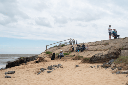 Image no.1 was one that I liked however omitted because it was a bit dark and the subject was carrying a pink and white sieve. It appears in the image like an artefact and is really distracting. Image no.2 I’ve included towards because of the plastic bottle (which I moved to compose the shot). It may be too subtle. Image no.3 I like however I’m unsure of the quality. It was some weeks ago whilst there were still a lot of lockdown restrictions in place. It gave me the impression of the group of people ‘holding back the sea’ even though the original sea defences have eroded. Finally image no.4 felt ‘impending’. The chap on his phone sunbathing is being trapped by the falling cliffs and the incoming sea.