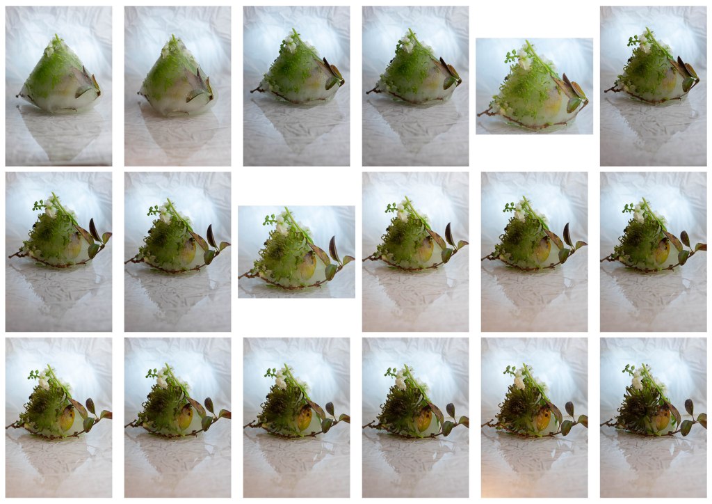 I chose to use an 85mm prime lens as I don’t own a macro lens. Lighting was difficult as I am inexperienced. Using an old sheet on my coffee table, I found some spotlights that I used to back light the scene, then a large portrait light positioned slightly to the side and a reflector over the top. Although my initial inspiration was originally Gersht, I particularly liked the approach from Marisa Culattos work.