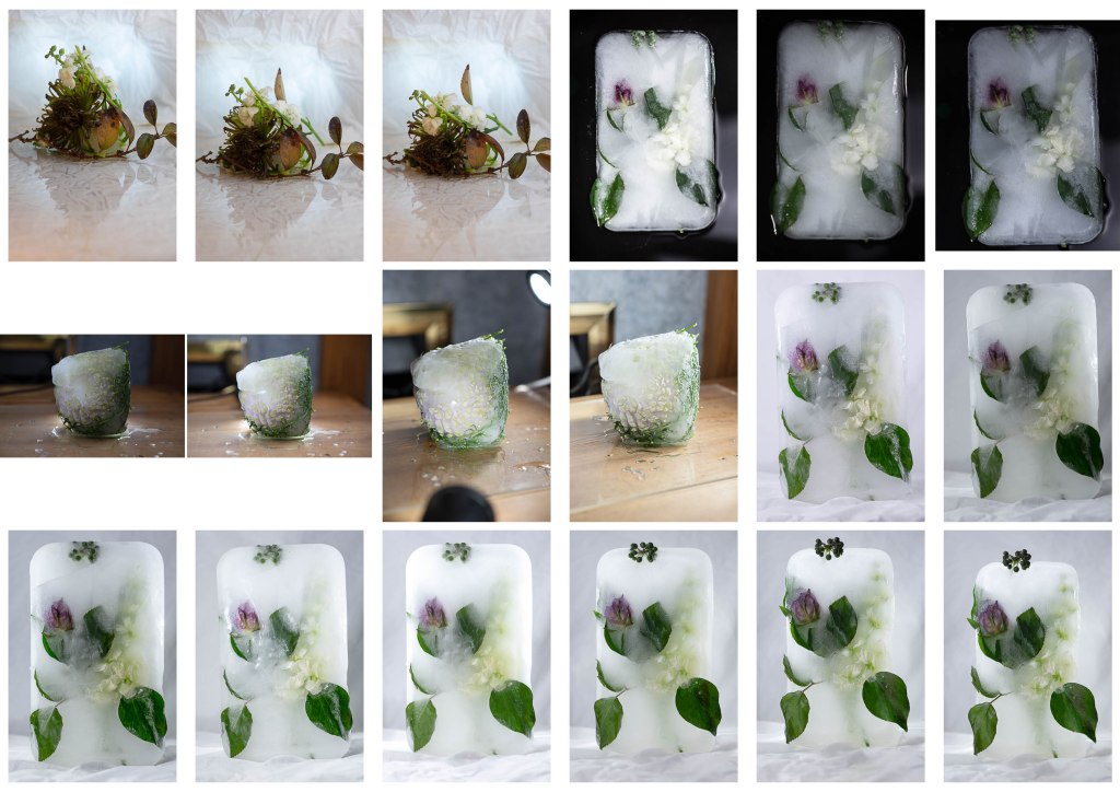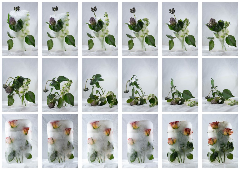 Building on the ideas of Ori Gersht, Makoto Azuma and Marissa Culatto, this piece explores the fragility of nature. By freezing the flowers in ice, their beauty is preserved. The very act of photography is to freeze and preserve a moment in time but it also demonstrates that this moment is lost forever. The cell walls within the flowers expand on freezing. What we see as the ice melts, is the flowers quickly degrade demonstrating how fragile life can be.