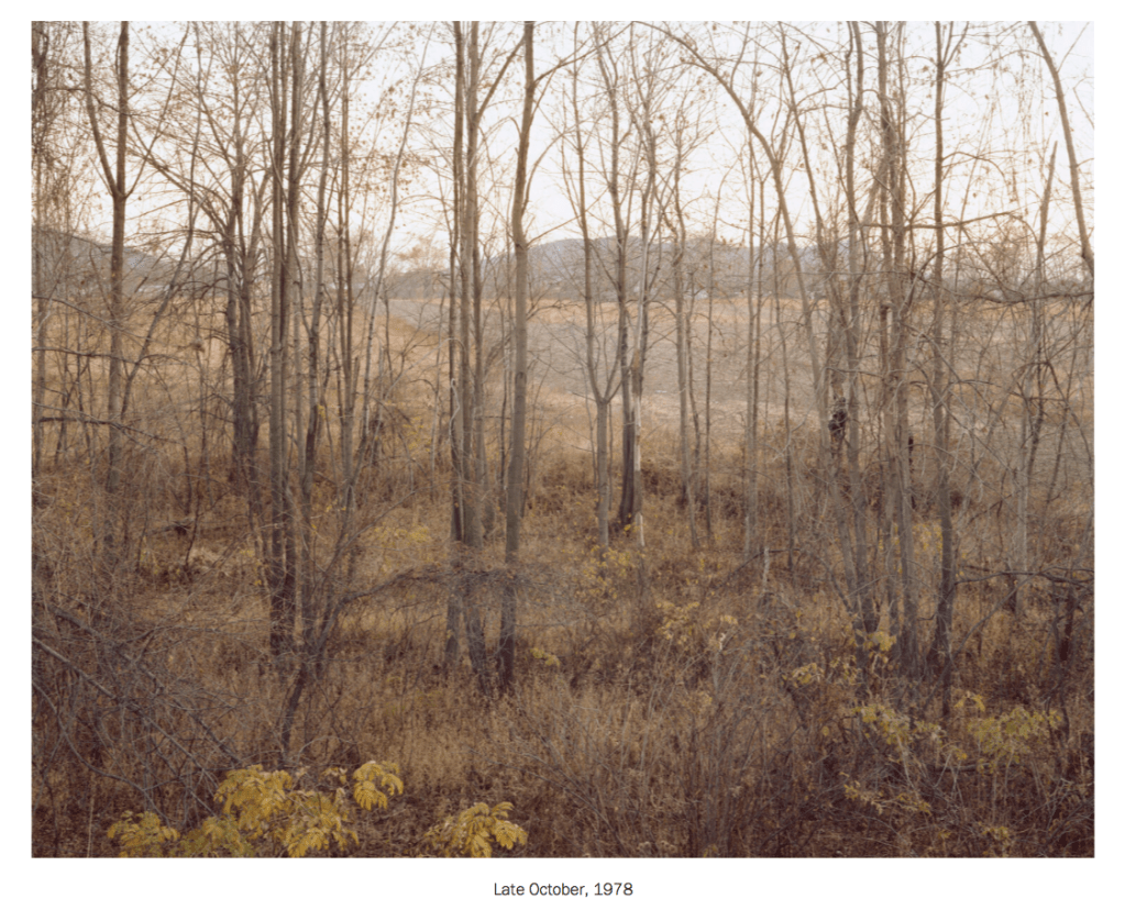 The photo series begins with the above quote. Although the images are taken in America, they could very easily be my local area. The images show various seasons and the changes that occur. They depict natural wilder areas alongside traces of human activity in the farmed fields, camp fire and tyre tracks. There are beautiful changes in the light, from the colder tones of the low winter sun to the warmer elements of summer.